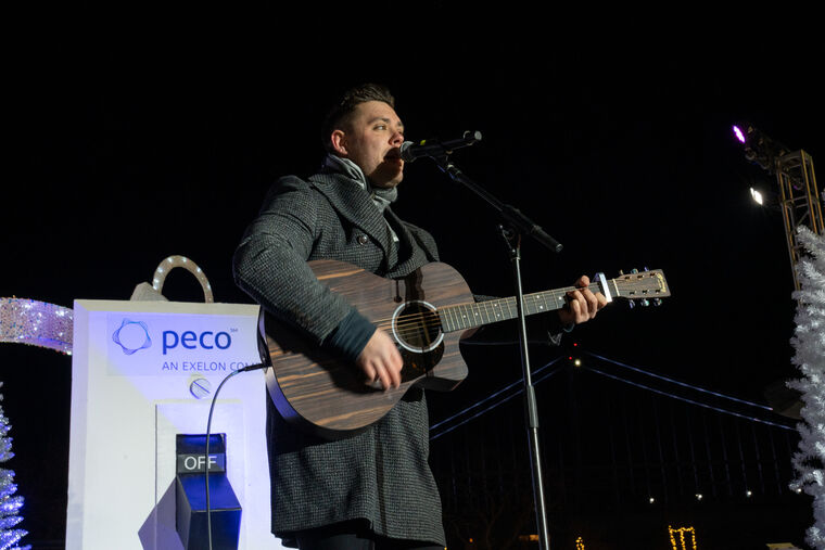 Tyler Kingsley captivates the crowd with a holiday tune at the Holiday Tree Lighting Powered by PECO, with the Ben Franklin Bridge in the background.